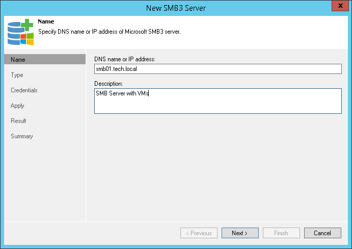 At the Name step of the wizard, specify an address and description for the Microsoft SMB3 server or cluster.
