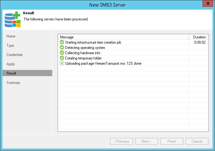 At the Result step of the wizard, complete the procedure of Microsoft SMB3 server or cluster adding.