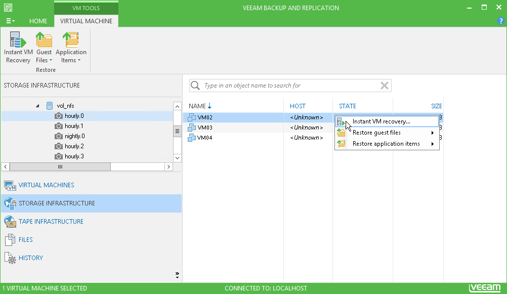 - In the working area, select the VM and click Instant VM Recovery on the toolbar. You can also right-click the VM you want to restore and select Instant VM Recovery.