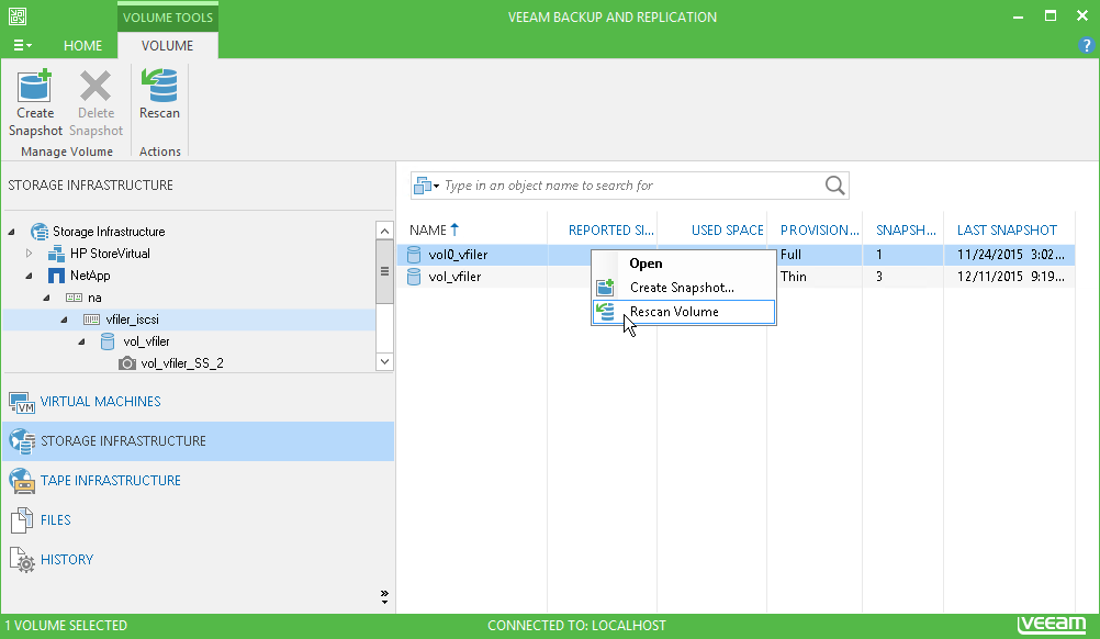 The storage system hierarchy can be very extensive, and the rescan process can take much time. To minimize the rescan time, you can instruct Veeam Backup Free Edition to rescan only specific volumes.
