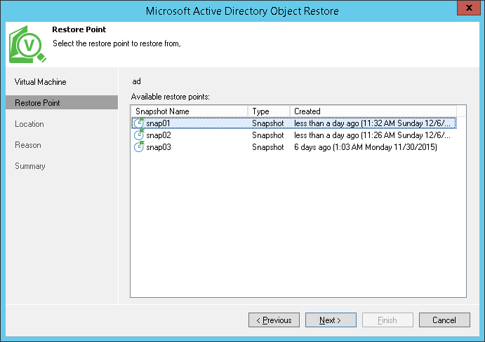 At the Restore Point step of the wizard, Veeam Backup Free Edition will display all storage snapshots on which VM disks are available. Every snapshot acts as an independent restore point. Select the snapshot from which you want to restore Microsoft Active Directory objects.