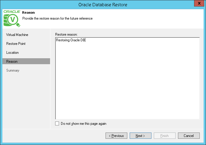 At the Reason step of the wizard, enter the reason for restoring a database from the Oracle VM if necessary. The information you provide will be saved in the session history and you can view it later.