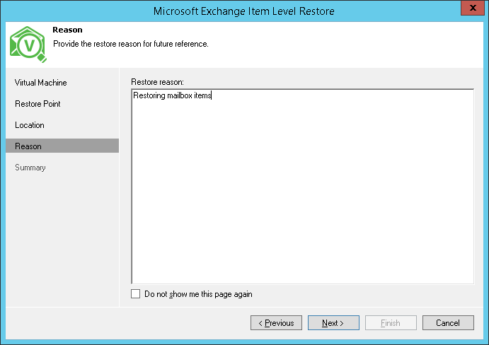 At the Reason step of the wizard, enter the reason for restoring data from Microsoft Exchange if necessary. The information you provide will be saved in the session history and you can view it later.