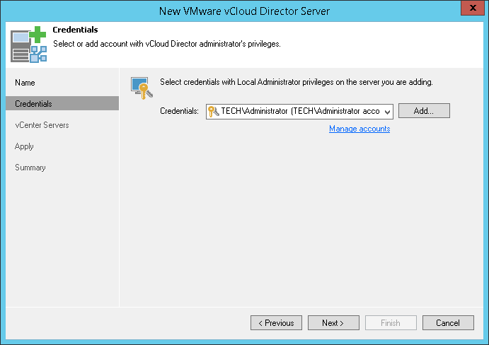 From the Credentials list, select credentials for the account that has administrator privileges on VMware vCloud Director. If you have not set up credentials beforehand, click the Manage accounts link at the bottom of the list or click Add on the right to add the credentials. For more information, see Managing Credentials.