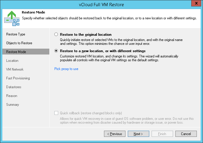 At the Restore Mode step of the wizard, choose the necessary restore mode and backup proxy for VM data transport: