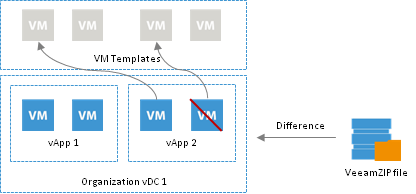 - Veeam Backup Free Edition calculates a signature for the consolidated VM disk in the VeeamZIP file (containing the VM template data and data of the delta file) and the signature for the VM existing in vCloud Director. Veeam Backup Free Edition then compares the disk signatures to define what data blocks have changed.