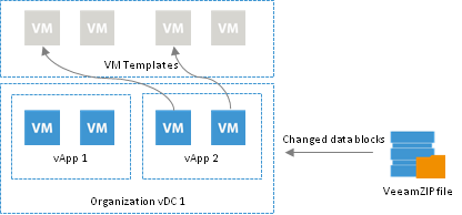 In this case, Veeam Backup Free Edition uses the same algorithm as for restore of full VMs in the virtual environment. It retrieves the data of the consolidated VM disk from the VeeamZIP file and restores the VM in the vCloud Director hierarchy.