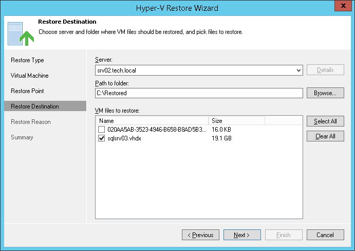 At the Restore Destination step of the wizard, select the VM files you want to restore and destination where the restored files must be stored.