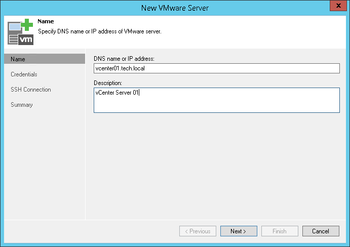 At the Name step of the wizard, specify an address and description for the VMware vSphere server.
