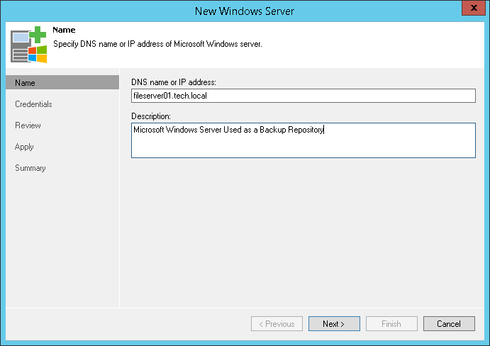 At the Name step of the wizard, specify an address and description for the Microsoft Windows server.