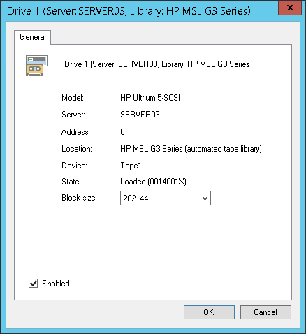 To disable a drive, clear the Enabled option in the drive properties. To set the drive into working mode again, select the Enable option. You can disable a drive, for example, for maintenance. When you disable a drive, the library does not use this drive for read/write operations. If the library has multiple drives, other drives will be used for the read/write operations.