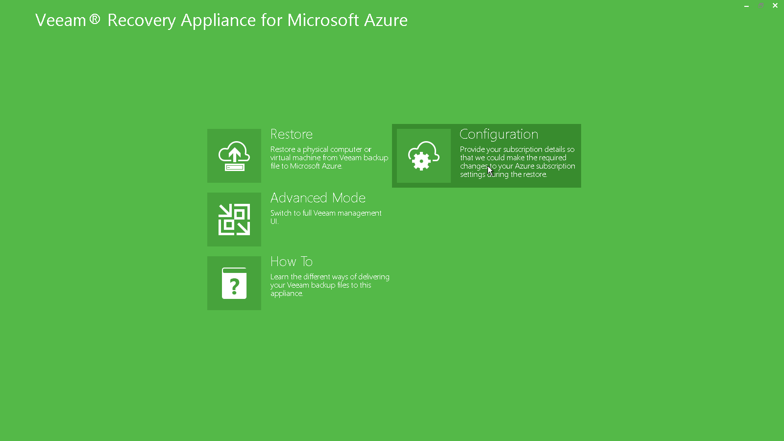 1. On the main screen of Veeam Direct Restore to Microsoft Azure, click Configuration.