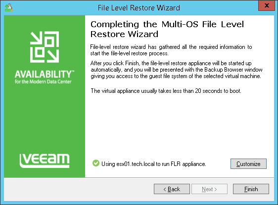 At the last step of the wizard, click Finish to start restoring VM guest OS files. The file-level restore appliance may take about 10-40 seconds to boot.