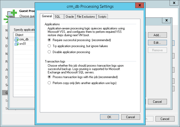 [For Microsoft SQL Server VMs and Oracle VMs] You will have to specify settings for transaction log handling on the SQL and Oracle tabs of the VM Processing Settings window. For more information, see Transaction Log Settings: Microsoft SQL and Transaction Log Settings: Oracle.
