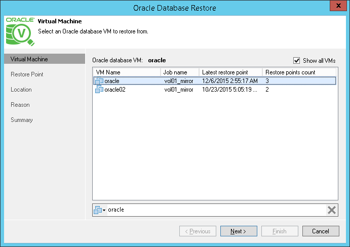 At the Virtual Machine step of the wizard, Veeam Backup & Replication displays all Oracle VMs with disks on storage volumes. Select the necessary VM in the list. If the necessary VM is not displayed automatically, select the Show all VMs check box. Veeam Backup & Replication will display all VMs with disks on storage volumes.