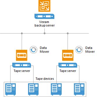 With Veeam Backup & Replication, the data transfer during archiving and restore processes is enabled with Veeam Data Mover services. The Data Movers run on tape servers and other components of backup infrastructure. They receive tasks from the Veeam backup server and communicate to each other to transfer the data.