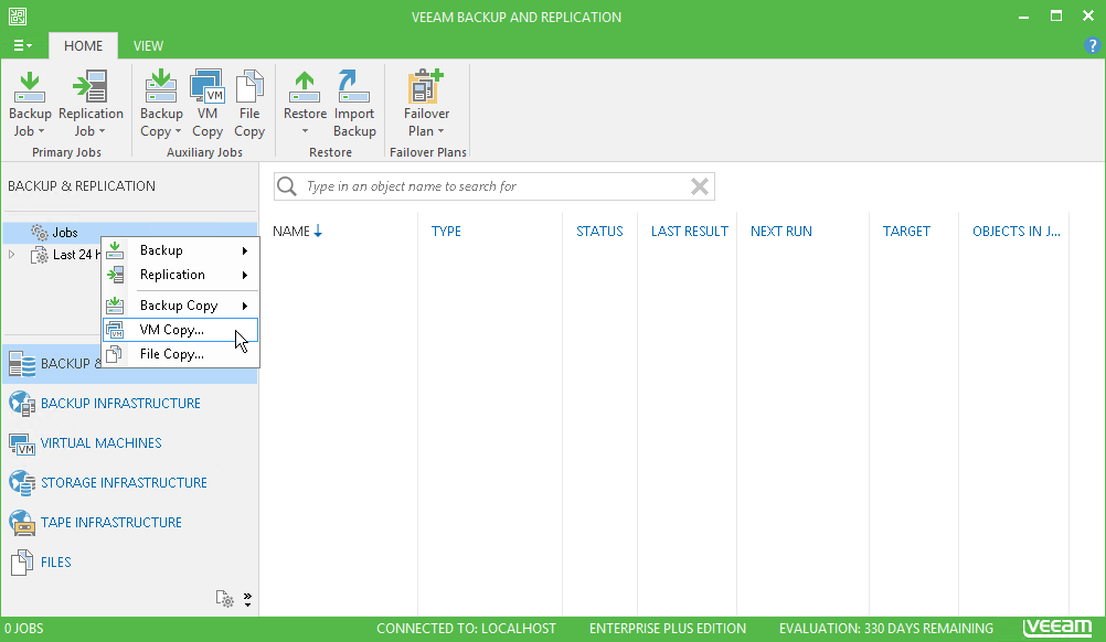 - Open the Backup & Replication view. In the inventory pane, right-click Jobs and select VM Copy.
