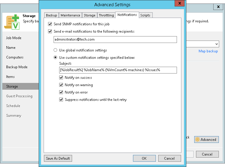 - Select the Suppress notifications until the last retry check box to receive a notification about the final job status. If you do not enable this option, Veeam Backup & Replication will send one notification per every job retry.