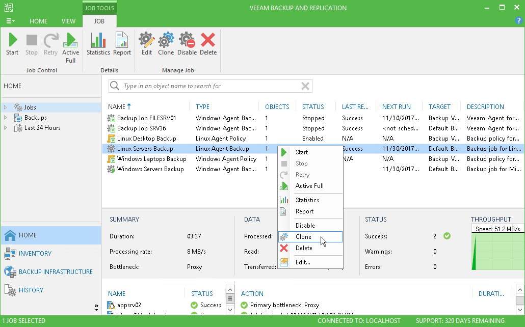 You can clone Veeam Agent backup jobs configured in Veeam Backup & Replication. For example, you may want to configure a Veeam Agent backup job that will be used as a ‘job template’, and use this job to create multiple jobs with similar settings.