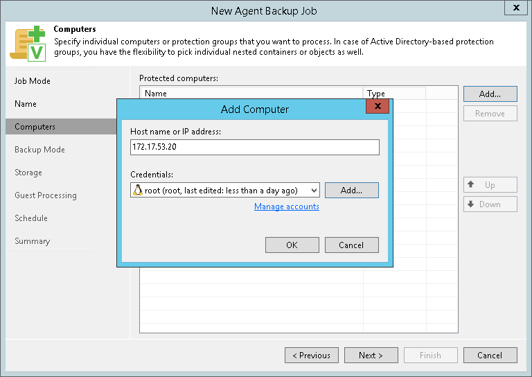 - From the Credentials list, select a user account that has administrative permissions on the computer that you want to add to the job. If you have not set up credentials beforehand, click the Manage accounts link or click Add on the right to add credentials. For more information, see the Credentials Manager section in the Veeam Backup & Replication User Guide at: https://www.veeam.com/documentation-guides-datasheets.html.