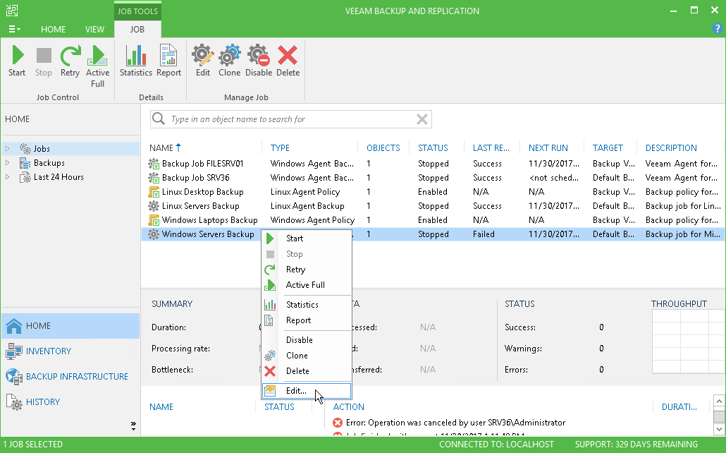 You can edit Veeam Agent backup jobs configured in Veeam Backup & Replication at any time. For example, you may want to edit a backup job to change the backup scope, target location or job scheduling settings.