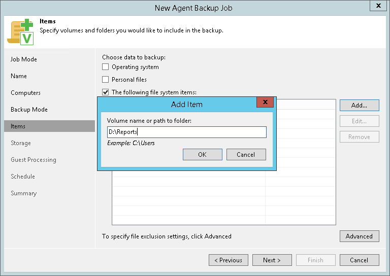 - In the Add Item window, type the path to a folder that you want to back up, for example, D:\Reports, and click OK.