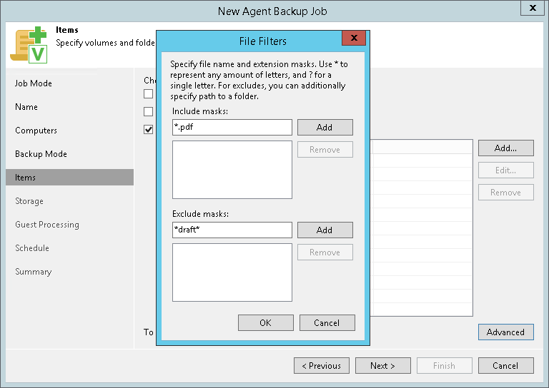 - In the Include masks field, specify file names and/or masks for file types that you want to back up, for example, MyReport.pdf, *filename*, *.docx. The resulting Veeam Agent backup will contain only selected files. Other files will not be backed up.
