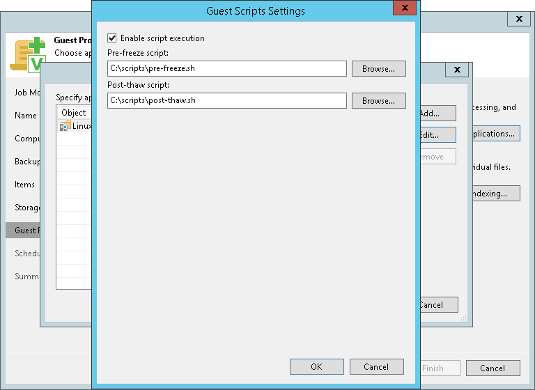 - In the Pre-freeze script and Post-thaw script fields, click Browse to choose executable files from a local folder on the backup server.