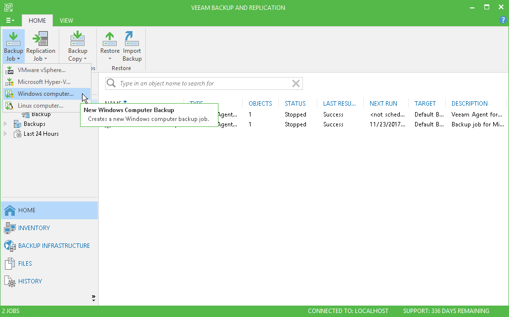 - Open the Home view. Select the Jobs node and click Backup Job > Windows computer on the ribbon.