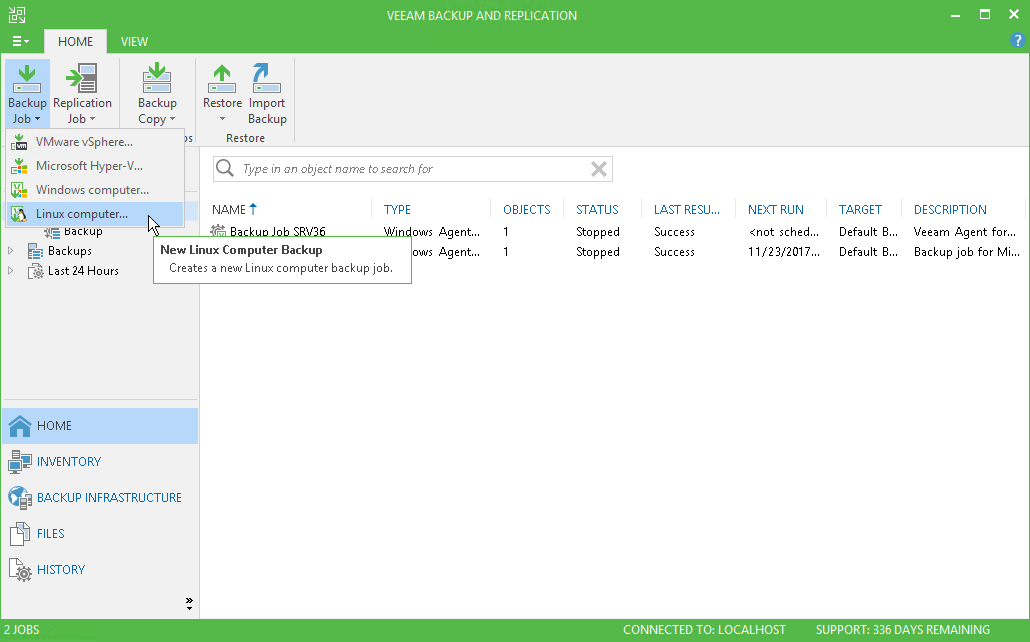 - Open the Home view. Select the Jobs node and click Backup Job > Linux computer on the ribbon.
