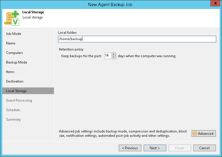 - In the Local folder field, type a path to a folder on a protected computer where backup files must be saved. If the specified folder does not exist in the file system of a protected computer, Veeam Agent for Linux will create this folder and save the resulting backup file to this folder. If the volume on which the specified folder must reside does not exist on a protected computer, Veeam Backup & Replication will not apply the backup job settings to this computer.