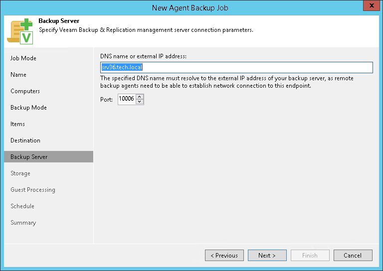 - In the DNS name or external IP address field, specify a DNS name or IP address of the Veeam backup server on which you configure the Veeam Agent backup job. The specified DNS name or IP address must be accessible from the network to which Veeam Agent computers are connected.