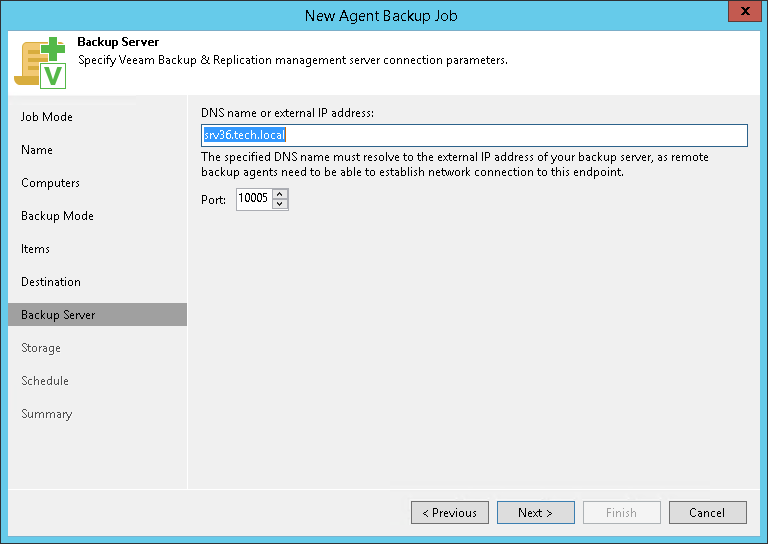 - In the DNS name or external IP address field, specify a DNS name or IP address of the Veeam backup server on which you configure the Veeam Agent backup job. The specified DNS name or IP address must be accessible from the network to which Veeam Agent computers are connected.