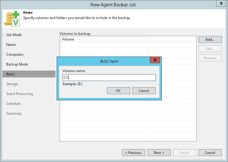 - In the Add Item window, type the drive letter of a volume that you want to back up, for example, C:\, and click OK.