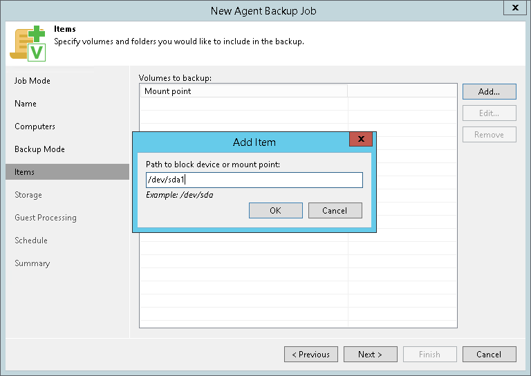 - To include individual volumes of a protected computer in the backup scope, type the volume mount point or path to a block device that represents the volume that you want to back up, for example: /dev/sda1.