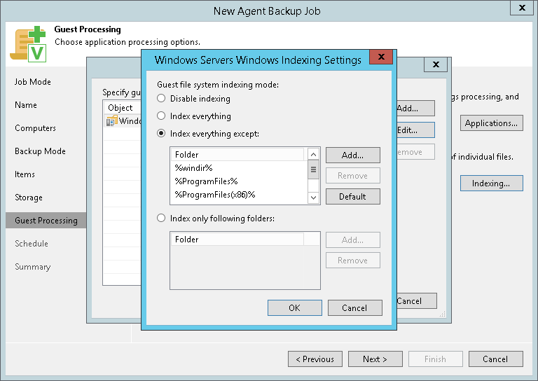 - Select Index everything if you want to index all files within the backup scope that you have specified at the Backup mode step of the wizard. Veeam Agent for Microsoft Windows will index all files that reside: