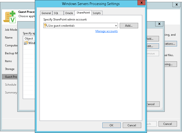 - From the Specify SharePoint admin account list, select a user account that Veeam Agent for Microsoft Windows will use to connect to the SharePoint application. If you have not set up credentials beforehand, click the Manage accounts link or click Add on the right to add credentials.