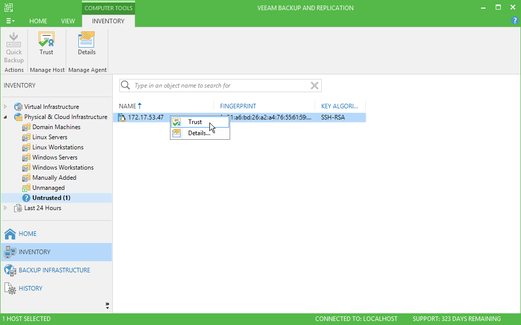 When you enable the Trust only known Linux hosts option in Veeam Backup & Replication settings, Linux-based computers whose fingerprints are not stored in the Veeam Backup & Replication database or the known_hosts file become unable to communicate to the Veeam backup server. During discovery, Veeam Backup & Replication puts such computers to the Untrusted protection group. To start managing an untrusted computer, you need to validate its fingerprint manually in the Veeam Backup & Replication console.