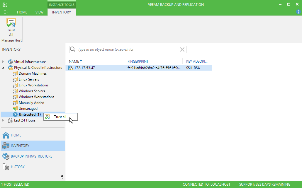 - To validate fingerprints of all untrusted computers at once, select the Untrusted node in the inventory pane and click Trust All on the ribbon. Alternatively, you can right-click the Untrusted node and select Trust all.