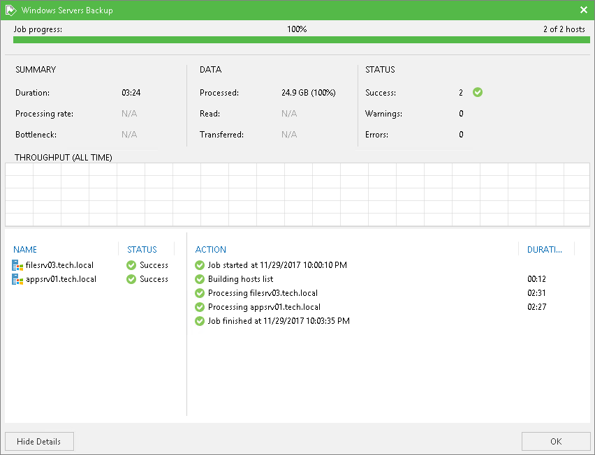 You can view statistics about Veeam Agent backup jobs configured in Veeam Backup & Replication. For Veeam Agent backup jobs managed by the backup server, Veeam Backup & Replication displays statistics in the similar way as for backup jobs for VM data backup. The main differences are the following: