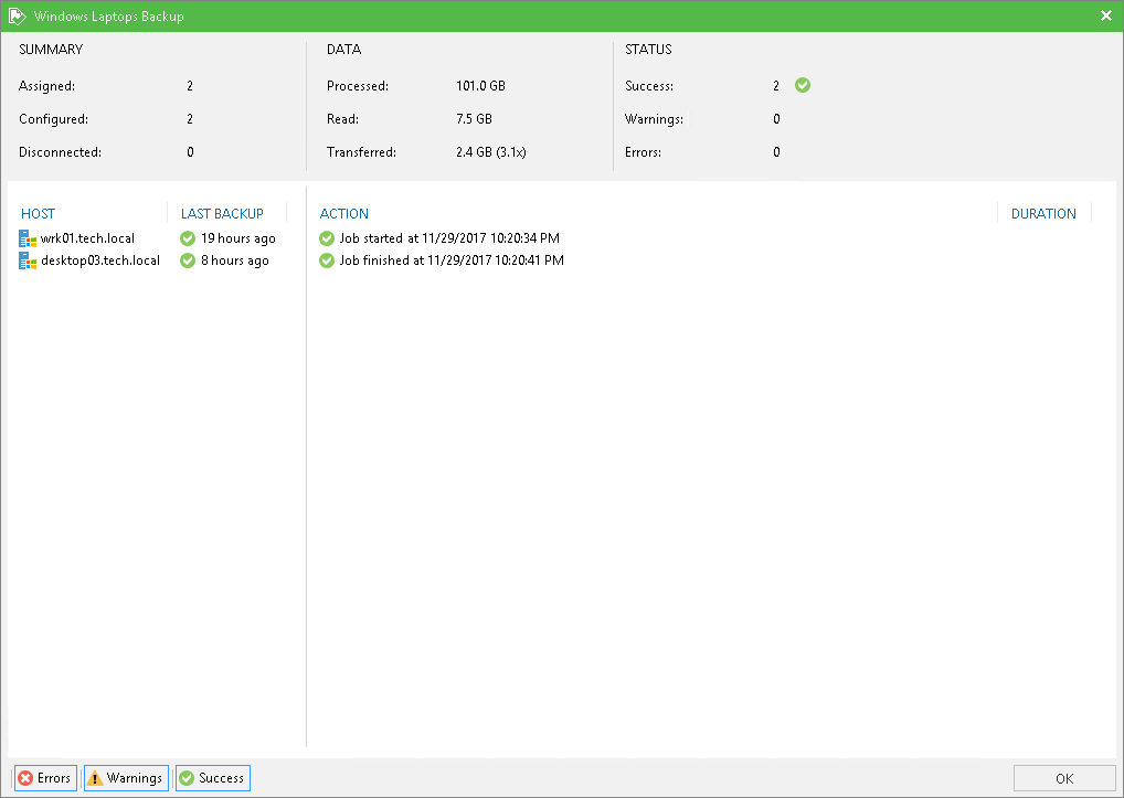 - You can use the Errors, Warnings and/or Success buttons at the bottom of the job statistics window to view details on operations that failed, completed with a warning or completed successfully during a Veeam Agent job session performance.
