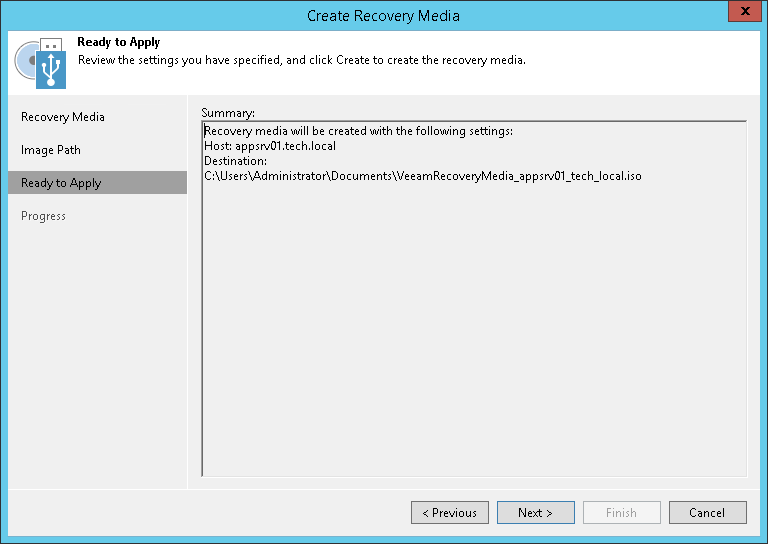 At the Ready to Apply step of the wizard, review settings of the recovery image that you plan to create and click Create.
