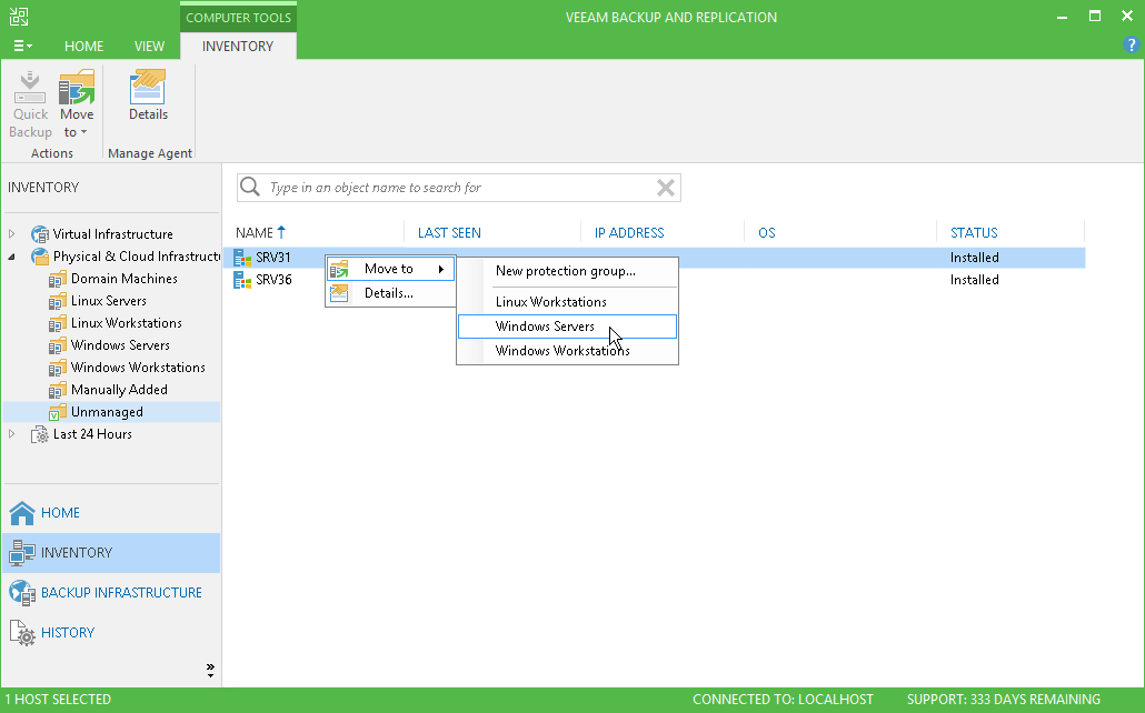 - When you move an unmanaged computer to an already existing protection group, Veeam Backup & Replication adds this computer to the protection group and starts processing the computer according to discovery and deployment settings defined in the properties of the protection group. Veeam Backup & Replication discovers the added computer, checks whether Veeam Agent running on the computer needs upgrade and upgrades Veeam Agent if needed.