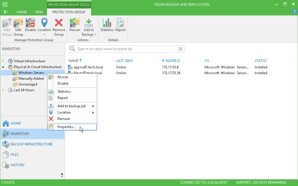- In the inventory pane, select the protection group that you want to edit and click Edit Group on the ribbon or right-click the protection group that you want to edit and select Properties.