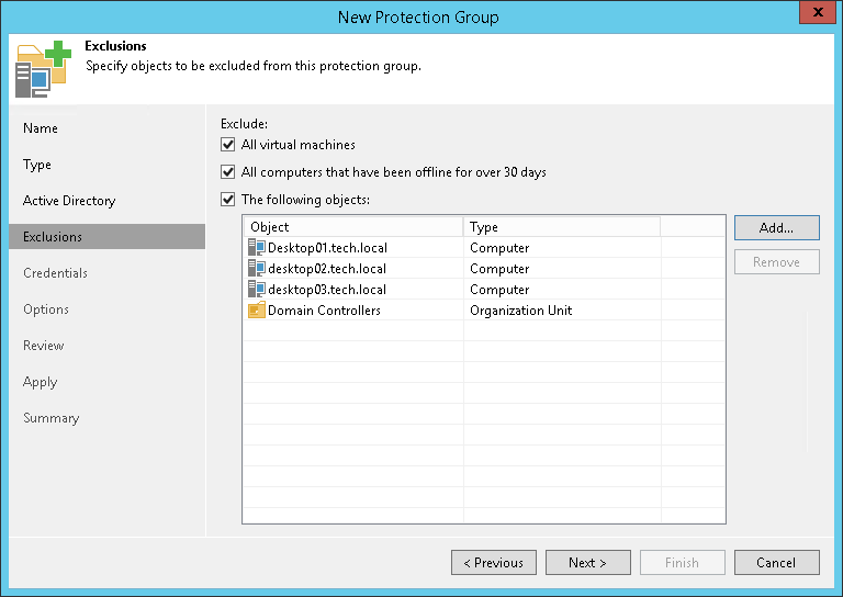 At this step of the wizard, you can specify which objects you want to exclude from the protection group. You can exclude the following types of objects: