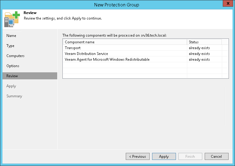 At the Review step of the wizard, review what Veeam Backup & Replication components are already installed on the distribution server specified for the protection group and what components will be installed.