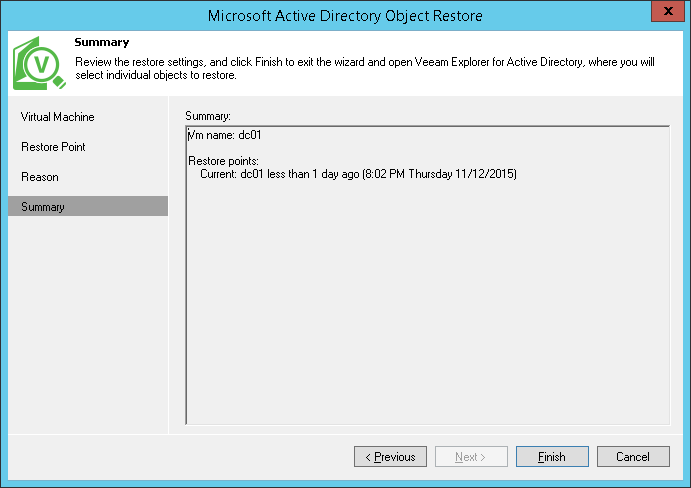 At the last step of the wizard, review the summary and click Finish to start the restore process.
