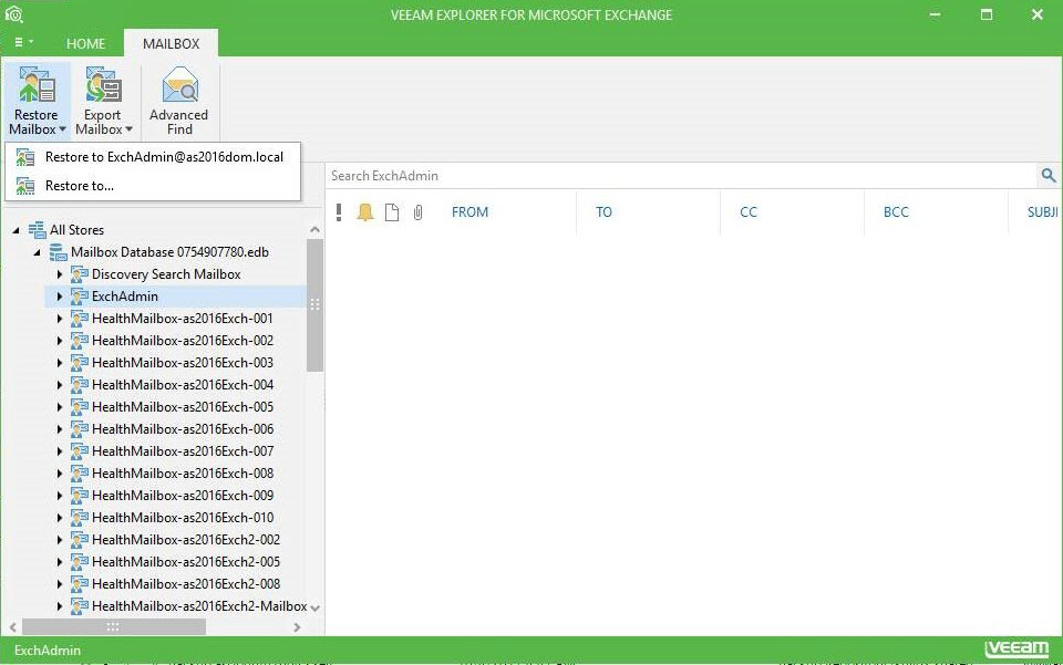 1-Click restore feature is only available when you run Veeam Explorer for Microsoft Exchange on a computer that is located within the same forest to which a backup of the Microsoft Exchange database belongs. |