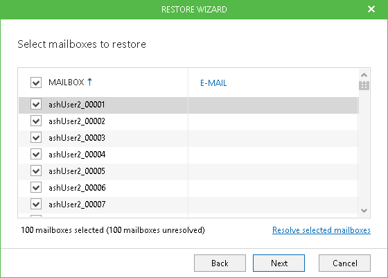 Select mailbox users whose mailboxes you want to restore. To Resolve selected mailboxes, click the corresponding link. Veeam Explorer for Microsoft Exchange detects e-mail addresses according to what you have selected and displays them next to the corresponding mailbox names, under the E-MAIL column.