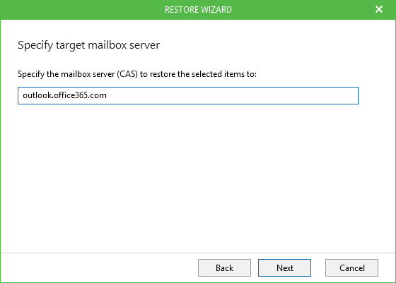- Specify the target mailbox server. Default CAS server will be selected automatically. For example, for Office 365 the default CAS is outlook.office365.com. If necessary, you may specify another CAS server. Click Next.